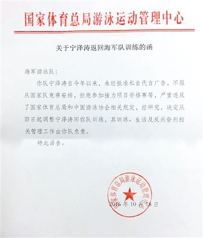 日前有媒體報道寧澤濤離隊的消息,并附有國家體育總局游泳運動管理中心內(nèi)部文件的照片,文件內(nèi)容為:“海軍游泳隊:你隊寧澤濤今年以來,未經(jīng)批準私自代言廣告,不服從國家隊競賽安排,拒絕參加接力項目資格賽,嚴重違反了國家體育總局和中國游泳協(xié)會相關規(guī)定,經(jīng)研究,決定從即日起調(diào)整寧澤濤回你隊訓練,其訓練、生活及反興奮劑相關管理工作由你隊負責。特此函告。”時間落款為2016年10月18日。