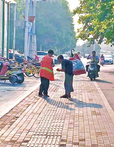 發(fā)生在鄭州金水路街頭的這一幕,剛好被市民拍到。昨日在網(wǎng)絡(luò)上發(fā)布后,感動(dòng)了很多網(wǎng)友。62歲的女環(huán)衛(wèi)工事后說(shuō):“這是應(yīng)該的,是小事,不值得宣傳?!备浇熳R(shí)她的人說(shuō),這名環(huán)衛(wèi)工是個(gè)熱心腸,之前已經(jīng)多次給流浪人員買(mǎi)飯、送水、送餐。