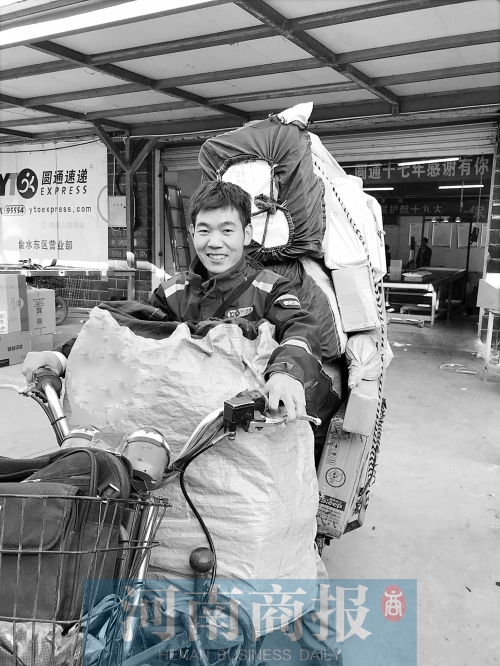 快遞小哥裝著滿滿的快遞,開始一天的“戰(zhàn)斗”