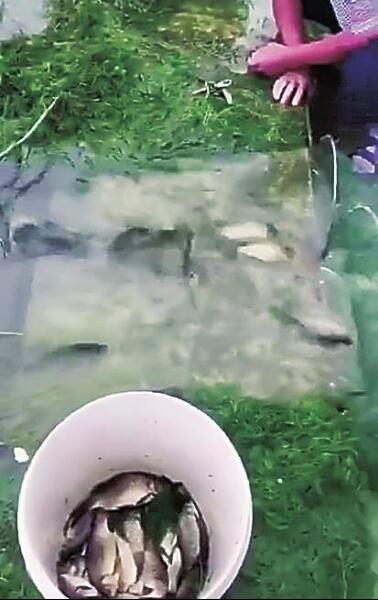 本次強(qiáng)降雨還導(dǎo)致固始縣境內(nèi)的多條河流水位暴漲,河邊地勢較低的農(nóng)田被淹沒。在固始縣城郊,一口水塘因為水位暴漲,水從塘埂一處低洼處溢出,水塘內(nèi)大量鯽魚紛紛隨著水流準(zhǔn)備出逃。村民發(fā)現(xiàn)后,在水流下方用網(wǎng)攔住魚兒去路,不一會兒就收獲一水桶鯽魚。
