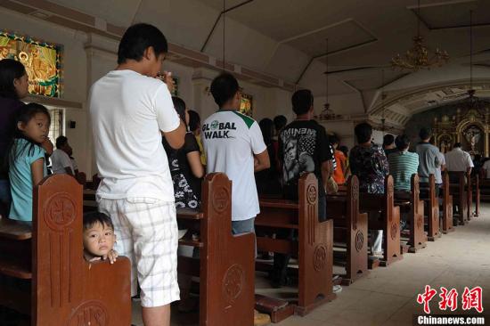 11月17日,菲律賓中部港口城市奧爾莫克大批民眾在當(dāng)?shù)匾蛔烫脜⒓訌浫?,尋求精神慰藉。中新社發(fā) 張明 攝