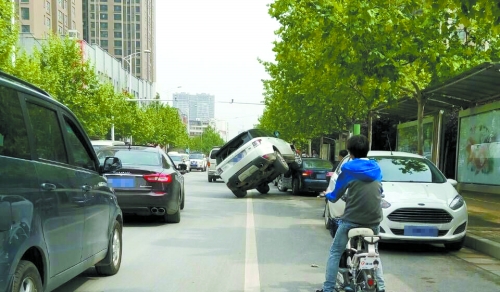 昨日上午10點(diǎn)20分,鄭州興華南街南三環(huán)公交站臺發(fā)生的一幕引起眾人圍觀:一輛路虎車“騎”在奧迪車上。