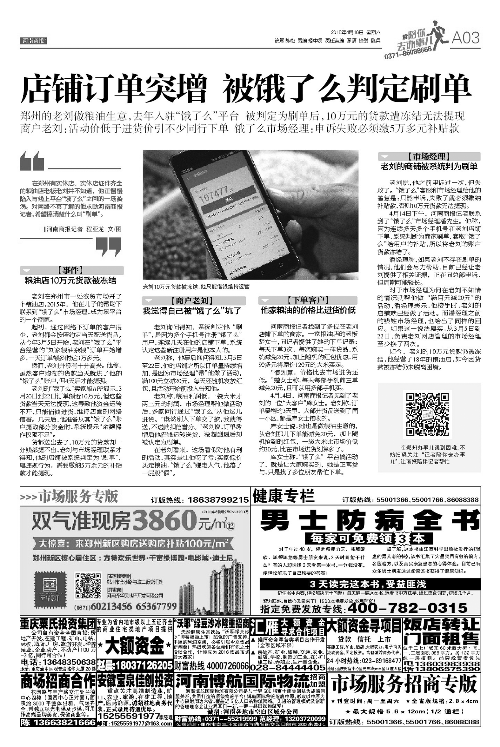 4月16日,《河南商報(bào)》以《店鋪訂單突增 被餓了么判定刷單》為題,對(duì)老劉10萬多元的交易款被凍結(jié)一事進(jìn)行報(bào)道,“餓了么”市場(chǎng)經(jīng)理潘先生稱,因?yàn)檫B續(xù)多天多個(gè)手機(jī)號(hào)在老劉店鋪下單,系統(tǒng)判斷為商家刷單,套取“餓了么”給用戶的補(bǔ)貼,所以將老劉的賬戶貨款凍結(jié)了。