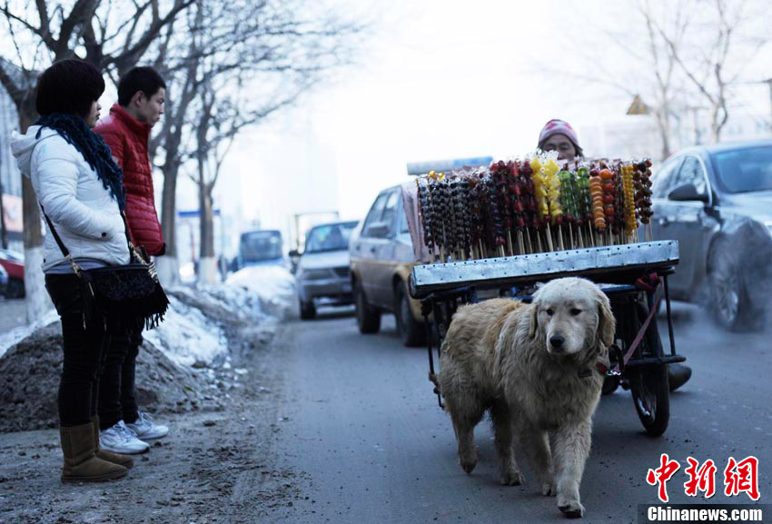 2月6日,在長春市一條繁華的街路上,一只小狗幫助身殘主人拉車賣冰糖葫蘆,成為長春冬日街頭一道感人的風景線。據(jù)主人介紹,雖然自己身殘且貧窮,但并不想靠別人救濟度日,因此學會了制作冰糖葫蘆的手藝,并以此自食其力。而他養(yǎng)的這條小狗“大黃”也是對主人不離不棄,每日都會幫助主人拉車外出謀生。圖為小狗拉著主人的糖葫蘆車走在繁華的街道上。張瑤 攝