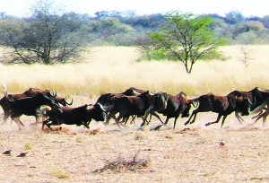 沒有交談,沒有笑聲,保持著靜默的狀態(tài),連越野車也盡量壓抑著發(fā)動(dòng)機(jī)的聲音,我們緩慢地向一群牛羚靠近。這幫家伙可是好不容易才安靜下來(lái)的,在遠(yuǎn)距離上,不等動(dòng)物完全靜止下來(lái)是很難打中的,剛才的一槍就放空了,驚嚇得它們奔跑了好久。