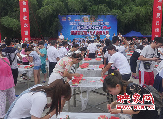 “挑戰(zhàn)吉尼斯 萬人吃西瓜”是由欒川重渡溝風(fēng)景區(qū)和鄭州支點旅游品牌策劃有限公司聯(lián)合打造的2016“燕京啤酒”重渡溝第八屆音樂啤酒狂歡節(jié)狂歡不停歇第三期主題活動。當(dāng)日重渡溝景區(qū)熱鬧非凡,擺滿誘人西瓜的小方桌次第擺開,翠綠的皮、鮮紅的瓤、瓜香四溢。游客們熱情參與,現(xiàn)場妙趣橫生。有“推土機”式掃蕩吃法,有“生猛”地大口吞咽,有小朋友萌態(tài)啃瓜表情十足......真是吃得爽快,玩得暢快,贏得痛快。比賽分為“狼吞虎咽”男子組、“大快朵頤”女子組,每組冠軍將獲得3000元現(xiàn)金大獎。經(jīng)過淘汰賽、決賽層層激烈角逐,最終比賽決出男女子組一、二、三等獎各一名,所有參賽選手都乘興而來,滿載而歸!“來重渡溝吃西瓜感覺特別甜,特別痛快!從來沒有跟這么多人一起吃西瓜,一口氣連吃三塊還不過癮!”一位游客笑著對記者說。