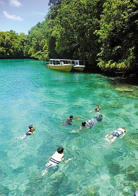 說帕勞是一個水漾的天堂,一點也不為過。這里不僅以海底景觀聞名于世,被海洋學家公認為世界七大海底奇觀之首,海面景觀也同樣令人贊嘆。由于帕勞的海水清澈無污染而其海底景觀造型奇特,一會兒是黑黑的礁石,一會兒是斑斕的軟硬珊瑚,抑或是細細沙礫,還有遠古時代沉積的火山灰,這一切都被清澄的海水毫無保留地映上了海面,令海水有7種不同的顏色,這讓每一位到此地的游客都贊嘆不已,更成為潛水者的勝地。