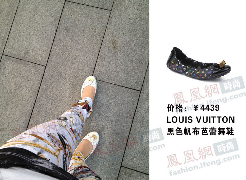 腳穿老花LV芭蕾舞鞋。印花上衣、印花褲子、大LOGO鞋,這是唱哪出?