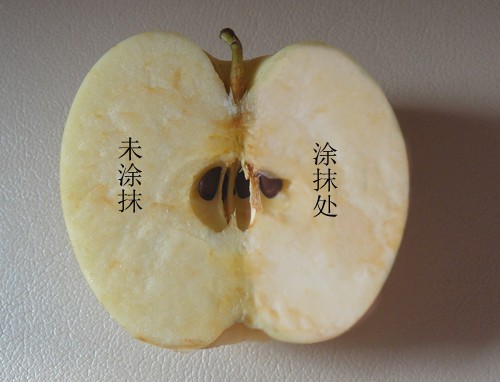把涂抹了精華液的蘋果放在未見陽光的桌上4小時(shí)后,涂抹精華液的右面沒有氧化變黃,依然水分充足,滋潤新鮮,而未涂抹的左面就因?yàn)檠趸兊冒迭S干澀。這就說明它的抗氧化性極強(qiáng),對肌膚有很強(qiáng)的保護(hù)作用。