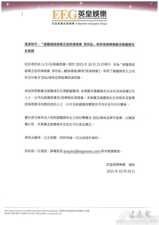 謝霆鋒經(jīng)紀(jì)人霍汶希表示“本集團(tuán)及謝霆鋒先生從來沒有授權(quán)任何人士、公司或組織宣傳或舉辦該演唱會。本集團(tuán)及謝霆鋒先生于發(fā)布及宣傳該演唱會及有關(guān)訊息的人士、公司及組織毫無關(guān)系,不存在任何合作關(guān)系。”以免粉絲受騙,同時保留一切法律追究權(quán)利。