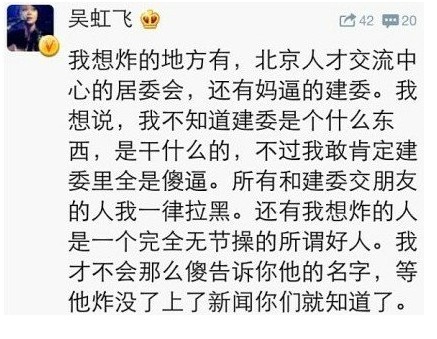 吳虹飛發(fā)表的不當(dāng)微博言論是:“我想炸的地方有北京人才交流中心的居委會(huì),還有媽逼的建委。我想說(shuō),我不知道建委是什么東西,是干什么的,不過(guò)我敢肯定建委里全是傻逼。所有和建委交朋友的人我一律拉黑。還有我想炸的人是完全無(wú)節(jié)操的所謂好人。我才不會(huì)那么傻告訴你他的名字,等他炸沒(méi)了上了新聞你們就知道了?!?/p>