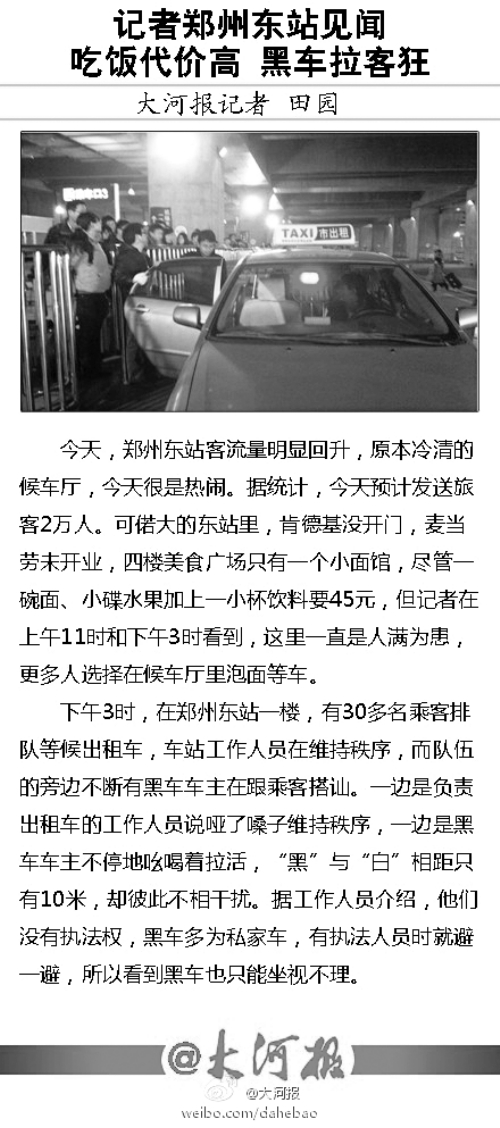 昨天,鄭州東站迎來(lái)一次客流小高峰,當(dāng)天,共發(fā)送旅客將近2萬(wàn)人次。記者來(lái)到鄭州東站體驗(yàn)發(fā)現(xiàn),平素空曠無(wú)人的西廣場(chǎng),出現(xiàn)了很多乘客的身影,三樓候車室也很熱鬧。但與熱鬧場(chǎng)景不相配的是,鄭州東站很多細(xì)節(jié)還未顧及到,吃飯代價(jià)高,“黑出租”與“白出租”公然搶生意。