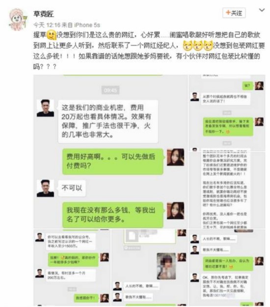 6月6日,某酒吧駐唱女歌手通過自己的微博發(fā)布了幾張聊天截圖。聊天內(nèi)容大意是酒吧駐唱女歌手找了一位可以網(wǎng)紅經(jīng)紀人,期望他能夠把自己炒成網(wǎng)絡紅人,而每次推成功一次紅人,大概費用至少是20萬起。