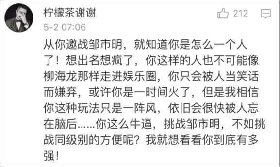 先是向奧運(yùn)冠軍鄒市明下戰(zhàn)書,就引來很多網(wǎng)友的不滿,被指炒作。