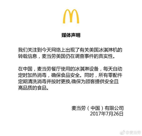 7月26日23時(shí)許,麥當(dāng)勞官方微博發(fā)布了《關(guān)于美國(guó)冰淇淋機(jī)的媒體聲明》:“我們關(guān)注到今天網(wǎng)絡(luò)上出現(xiàn)了有關(guān)美國(guó)冰淇淋機(jī)的轉(zhuǎn)載信息,麥當(dāng)勞美國(guó)仍在調(diào)查事件的真實(shí)性。在中國(guó),麥當(dāng)勞餐廳使用的冰淇淋設(shè)備,每天自動(dòng)定時(shí)加熱消毒,確保食品安全。同時(shí),所有零配件定期清洗消毒并按時(shí)更換,確保為顧客提供安全且高品質(zhì)的食品?!?/p>
