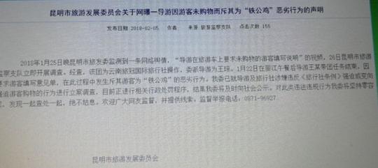 近日,網(wǎng)傳云南一導(dǎo)游斥未購(gòu)物游客為“鐵公雞”,引發(fā)關(guān)注。昆明市旅發(fā)委稱,2018年1月25日晚昆明市旅發(fā)委監(jiān)測(cè)到一條網(wǎng)絡(luò)輿情,“導(dǎo)游在旅游車上要求未購(gòu)物的游客填寫說明”的視頻,26日昆明市旅游監(jiān)察支隊(duì)立即開展調(diào)查。