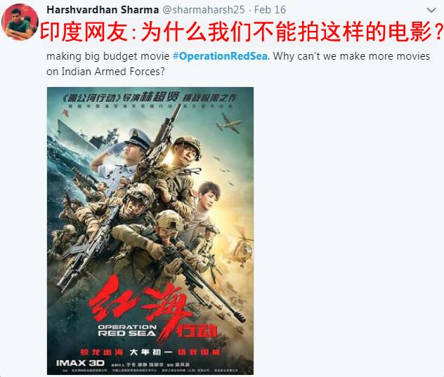 有意思的是,看到《紅海行動(dòng)》如此刷屏,一位印度網(wǎng)友顯然很是“眼紅”。他不無羨慕嫉妒地問道:“為什么我們印度就不能拍這樣的電影呢?”