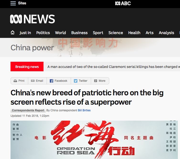 澳大利亞廣播公司新聞網(wǎng)分析稱,中國(guó)大銀幕上的新型愛國(guó)英雄反映了一個(gè)超級(jí)大國(guó)的崛起。作為中國(guó)強(qiáng)大外交自信在電影領(lǐng)域的展現(xiàn),銀幕英雄將會(huì)越來越多的揮舞著中國(guó)旗幟。