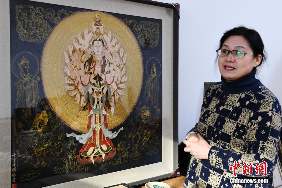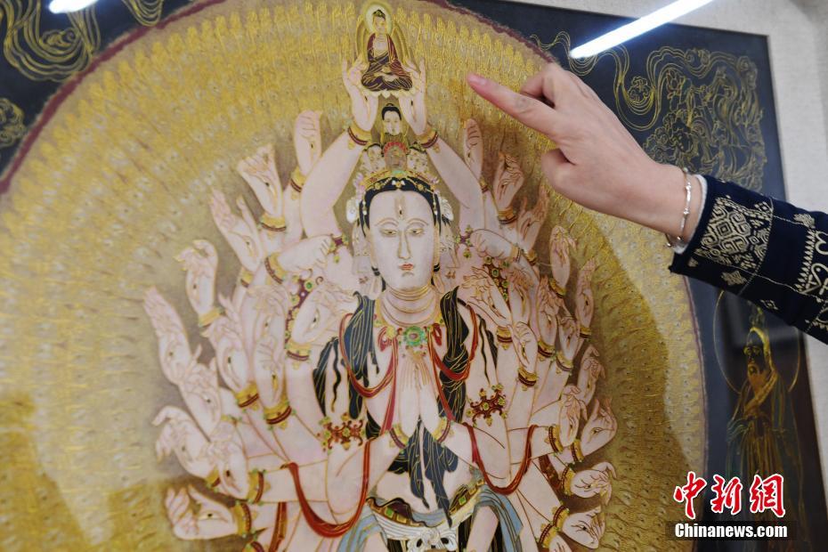 4月7日,蘭州文理學(xué)院女教師白茜介紹自己用萬(wàn)根金屬絲創(chuàng)作出的“千手千眼觀音”掐絲琺瑯畫(huà)。從小喜歡繪畫(huà)的白茜通過(guò)自己十幾年的摸索,以敦煌壁畫(huà)為范本制作掐絲琺瑯畫(huà)?!扒智а塾^音”是白茜最滿(mǎn)意的作品,用了萬(wàn)根一米左右的金屬絲臨摹完成。