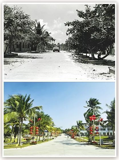 拼版照片為西沙永興島北京路今昔對(duì)比(上圖為1991年5月新華社記者姜恩宇攝,下圖為2016年2月5日新華社記者楊冠宇攝)。 新華社發(fā)
