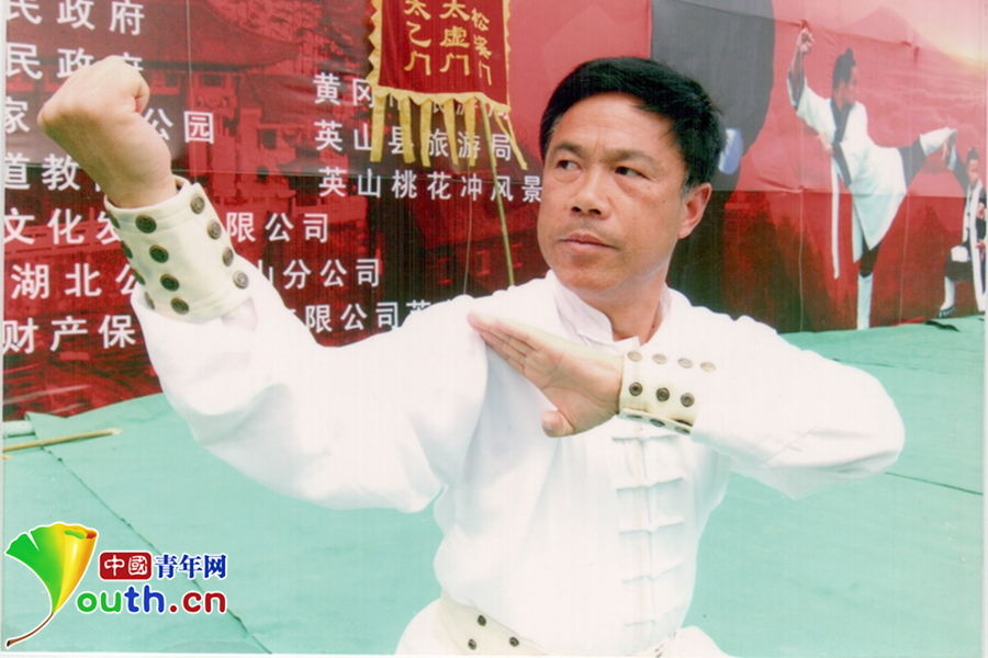 2007年5月在英山縣舉辦的第一屆“南武當(dāng)杯”國際武術(shù)節(jié)上,岳家拳傳承人張業(yè)金現(xiàn)場表演獻技。
