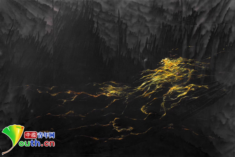 金線用蘇繡典型的平針繡法繡在真絲底料上,明暗金黃色從近處向遠(yuǎn)處延伸,燈光照射下,一如夜空中的萬家燈火。若有燈光照射,參觀者會發(fā)現(xiàn)整個底料上還暗藏一幅潑墨山水畫。