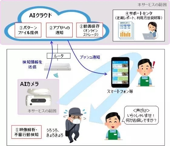 AI Guardman的示意圖。利用深度學(xué)習(xí)識別可疑行為,并通過app向店主發(fā)出警報,接著店員便可以前往提供禮貌性的幫助。