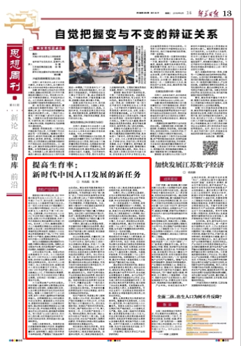 8月14日,江蘇省委機關報《新華日報》在第13版“思想周刊·智庫”欄目刊發(fā)了劉志彪、張曄聯(lián)合撰寫的題為《提高生育率:新時代中國人口發(fā)展的新任務》的署名文章。