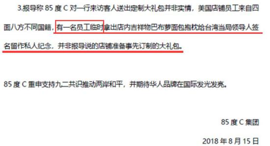 其次,有大陸網(wǎng)友還發(fā)現(xiàn)“85度C”的聲明中有將一切責(zé)任推給“臨時工”的嫌疑,并回避了導(dǎo)致這場風(fēng)波的“源頭”恰恰是跑到美國為臺獨“造勢”的蔡英文。