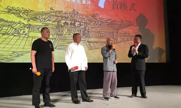 在掌聲中,河南電視臺、央視紀(jì)錄頻道的全體領(lǐng)導(dǎo)等與功夫名家們上臺共同啟動首映。