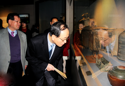 韓國(guó)朋友相繼參觀了河南博物院的《中原古代文明之光》基本陳列、《中原楚系青銅藝術(shù)館》、《河南古代玉器》、《河南明清館》等專題陳列的多個(gè)展覽。韓國(guó)朋友們精細(xì)地觀賞博物院陳展的文物,由衷感嘆中華民族祖先的智慧和博物院的陳列水準(zhǔn)。曾80多次訪華、第64次來(lái)河南的“中國(guó)通”許由先生頗為內(nèi)行的提問(wèn)令講解員和陪同參觀的中國(guó)人員刮目相看。中韓建交的20多年來(lái)許先生一直在為兩國(guó)及兩國(guó)人民的友誼盡其所能地做著工作,他曾多次率團(tuán)訪華,此次又為河南帶來(lái)了原首爾特別市瑞草區(qū)廳長(zhǎng)趙南浩、原空軍士官學(xué)校校長(zhǎng)吳昌煥和金星綜合電機(jī)株式會(huì)社會(huì)長(zhǎng)等新老朋友。