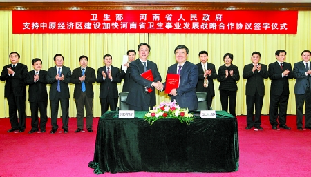 3月21日,衛(wèi)生部、河南省政府支持中原經(jīng)濟(jì)區(qū)建設(shè)加快河南省衛(wèi)生事業(yè)發(fā)展戰(zhàn)略合作協(xié)議簽字儀式在北京舉行。衛(wèi)生部部長陳竺(前右一),省長郭庚茂出席儀式并代表雙方在協(xié)議書上簽字。