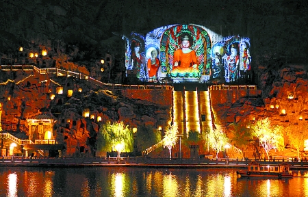 4月13日晚,河南洛陽龍門景區(qū)進(jìn)行了景區(qū)亮化工程提升后的首次試燈。2011年12月開始,龍門石窟景區(qū)進(jìn)行亮化提升,目前,景區(qū)內(nèi)的所有燈光已調(diào)試就緒,將于近期正式對(duì)游人開放。 新華社發(fā)