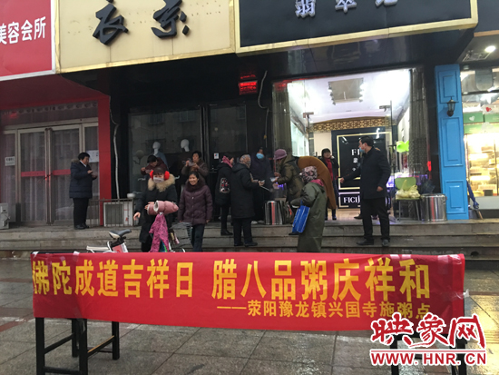 5日早上7點雖然下著小雨,滎陽市康泰路于廣武路交叉口西約100米路北,一家“翡翠紀”的店門口前卻是熱鬧非凡,一名身著僧服的僧人正在給過往市民從保溫桶里盛出熱氣騰騰的臘八粥。商家老板,上學學生,環(huán)衛(wèi)工人等紛紛來到門前,端著臘八粥喝了起來。