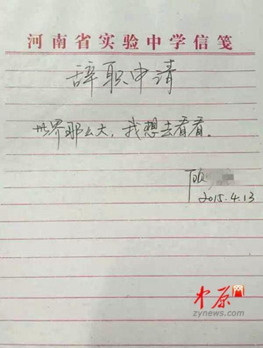 “世界那么大,我想去看看。”今年4月,鄭州的中學(xué)女老師顧少?gòu)?qiáng)因?yàn)橐环獗毁潪椤笆飞献罹咔閼艳o職信”在網(wǎng)絡(luò)上掀起風(fēng)浪。