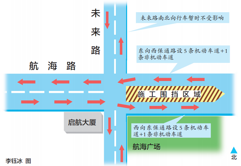 昨日,記者從交警四大隊(duì)了解到,隨著航海路一線地鐵5號(hào)線施工的推進(jìn),航海路未來路口即將開始搭建新的圍擋進(jìn)行站體施工,25、26日進(jìn)行模擬實(shí)驗(yàn),27日正式圍擋。屆時(shí)航海路東西方向車輛將會(huì)改行到新修的保通路面,由雙向8車道減為雙向5車道。未來路南北方向車輛暫不受影響。