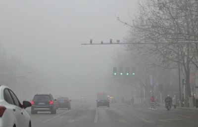 1月10日,霧霾鎖城,鄭州市區(qū)能見度很低。