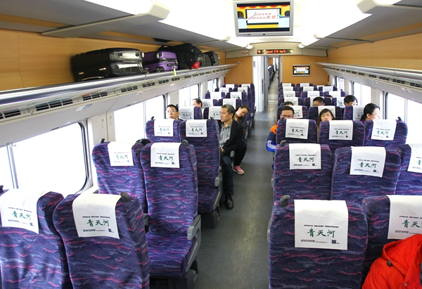 12點02分,記者在鄭州站乘坐C2967次列車再次體驗,發(fā)現(xiàn)車上的人數(shù)仍舊不多,多節(jié)車廂內只有十幾個人,而2號車廂竟然空無一人。17點31分,記者乘坐C2972返程時,車上的人數(shù)則相對較多,多數(shù)車廂有將近30人,最多的一節(jié)有近40人。