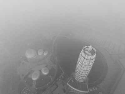 昨日(12月18日)中午,記者利用無(wú)人機(jī)爬升到最高升限500米仍舊沒(méi)能突破霧霾層,鏡頭中的“大玉米”籠罩在一片混沌當(dāng)中。