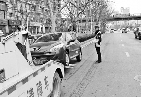 金水路已開啟嚴(yán)管模式,交警對路邊違停車輛進(jìn)行拖移。