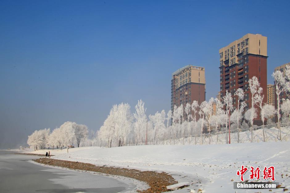 2014年1月21日,游客在吉林省吉林市松花江畔附近拍攝霧凇美景。吉林市2014年首場大雪后,松花江畔銀裝素裹,出現(xiàn)霧凇美景。中新社發(fā) 朱萬昌 攝 圖片來源:CNSPHOTO