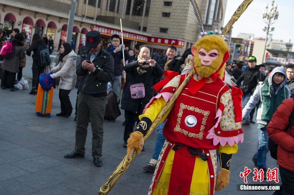 1月25日,孫悟空扮相的演員正在排隊買票。當(dāng)日,一名孫悟空扮相的旅客“快閃”現(xiàn)身北京站,引發(fā)周圍旅客和民眾圍觀。據(jù)了解,孫悟空的扮演者是一名來自北京電影學(xué)院的河南籍學(xué)生,由于自己很快也將成為2014春運(yùn)大軍中的一員,他表示希望用孫悟空勇敢機(jī)智的形象,以“快閃”的形式為旅途中的人們加油打氣,他同時也希望自己在新的一年里能有一番作為。中新社發(fā) 崔楠 攝