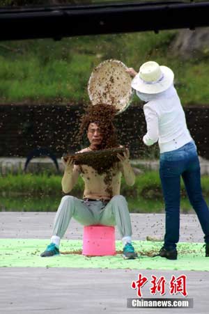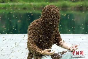5月13日,“吉尼斯中國之夜”在江西宜春明月山明月廣場舉行。江西“第一蜂人”、宜春市奉新縣養(yǎng)蜂人阮良明挑戰(zhàn)“人體肩部以上布滿蜜蜂堅(jiān)持時間最長”吉尼斯世界紀(jì)錄。最終,吉尼斯認(rèn)證官宣布,阮良明的人體肩部以上布滿蜜蜂堅(jiān)持時間為53分34秒,成功創(chuàng)造了吉尼斯世界紀(jì)錄。鄒海斌 攝