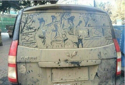 網(wǎng)友在成都偶遇一臟不溜秋的面包車!走近一看,后檔風玻璃上畫了一副美女圖,惟妙惟肖!~你只覺得我沒錢洗車,卻不知道我也有一顆藝術的心~~只是朋友,車牌被擋住了,等會兒警察蜀黍過來……