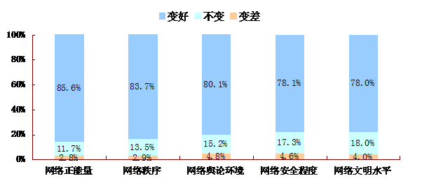 在這些網(wǎng)絡(luò)治理行動的作用下,網(wǎng)絡(luò)環(huán)境發(fā)生了明顯的改善,網(wǎng)民對于治理后的網(wǎng)絡(luò)環(huán)境也表現(xiàn)出明顯的積極評價,表示網(wǎng)絡(luò)環(huán)境發(fā)生積極變化的網(wǎng)民比例普遍在8成以上。其中,85.6%的網(wǎng)民認(rèn)為網(wǎng)絡(luò)充滿正能量,83.7%的網(wǎng)民認(rèn)為網(wǎng)絡(luò)秩序變得更好,80.1%的網(wǎng)民認(rèn)為網(wǎng)絡(luò)輿論環(huán)境得到改善,78.1%的網(wǎng)民認(rèn)為網(wǎng)絡(luò)安全程度提高了,78%的網(wǎng)民表示網(wǎng)絡(luò)文明水平提高了。