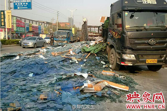 3、鄭州載玻璃貨車與轎車相撞 30多噸玻璃破欄而出