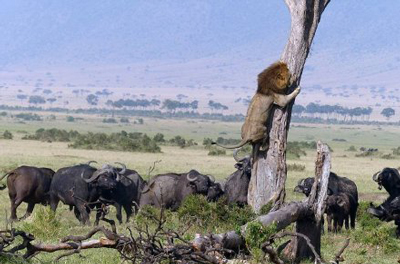 14、獅子被野牛群追趕 嚇壞瘋逃上樹