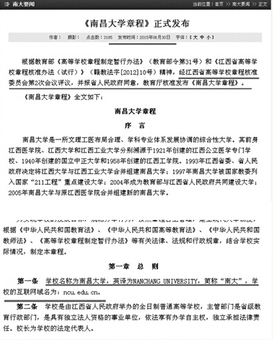 據了解,近日南昌大學在官方主頁南昌大學新聞網正式發(fā)布了《南昌大學章程》。記者看到,該章程系根據教育部《高等學校章程制定暫行辦法》和《江西省高等學校章程核準辦法(試行)》精神,經江西省高等學校章程核準委員會第2次會議評議,并報省人民政府同意,教育廳核準發(fā)布。