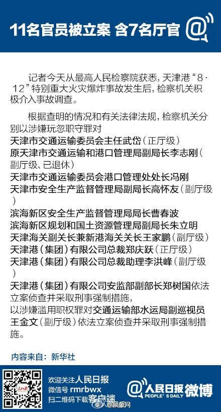 天津交通委主任武岱(正廳)、原天津交通運輸和港口管理局副局長李志剛(副廳、已退休)、天津安監(jiān)局副局長高懷友(副廳)、天津海關(guān)副關(guān)長王家鵬(副廳)、天津港集團(tuán)總裁鄭慶躍(正廳)、總裁助理李洪峰(副廳)、交通部水運局副巡視員王金文(副廳)。
