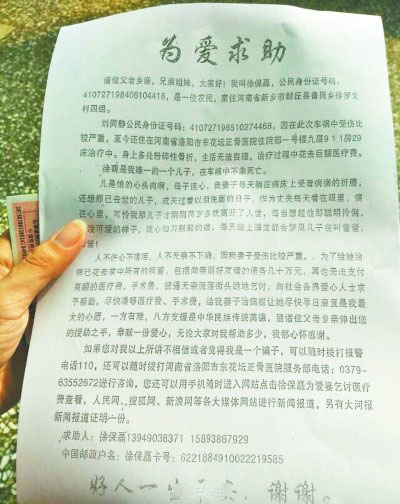 近日,有網(wǎng)友發(fā)微博稱,鄭州火車站候車廳,有個自稱徐保磊的人向旅客挨個散發(fā)傳單,稱妻子因出車禍住院無錢治療,向旅客乞討求助。經(jīng)多方調(diào)查:當(dāng)事人已出院兩年多,發(fā)傳單的不是徐保磊本人。大家不要上當(dāng)?。?/font>